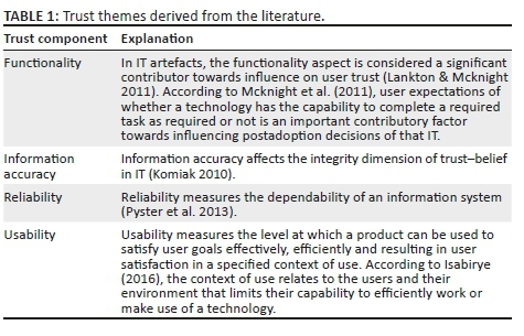 BACKGROUND: Information technology (IT) trust is an important concept as people today rely more on IT to perform their tasks than before. A current review of information systems literature suggests that trust in technology is a key determinant of technology adoption, use and an accelerator of understanding user perception. User perceptions of a technology's characteristics influences the users' initial decision to adopt the technology, while the user is less likely to make use of the technology if they perceive significant risk linked to the technology exploration.