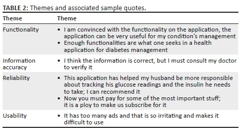 In this section, the findings from the analysis are presented. The findings were organised according to the four broad themes: functionality, information accuracy, reliability and usability. These themes describe different aspects of the participants' trust opinions of mobile applications for diabetes treatment and adherence behaviour towards adoption and continued use of these applications. Each theme discussed the implication of the participants' experiences when using the diabetes application for the research period. Table 2 gives summaries of the findings.
