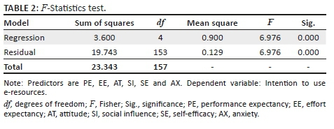 The F-statistic tests the significance of the regression model. It determines whether changes in the predictor variables (performance expectancy, effort expectancy, attitude, social influence, self-efficacy and anxiety) are associated with changes in the dependent variable (intention to use electronic resources). Table 2 shows that the F-test is significant, and because the p-value (0.000) is less than the significance level (0.005), the sample data provide sufficient evidence to conclude that the regression model fits the data better than the model with no independent variables (Hair et al. 2010).