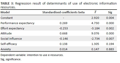 Linear regression analysis was used to estimate the coefficient of the linear equation of the independent variables; performance expectancy, effort expectancy, attitude, social influence, self-efficacy and anxiety that best predict the dependent variable; behavioural intention to use information resources, while facilitating conditions that was hypothesized to directly influence the use of EIR. Subsequent to performing linear regression on items that represented each group of the independent variables, the items in each group were merged together into one variable using the SPSS 'compute command'. This operation allowed for a single variable to represent each dimension of the independent and dependent variables. The results of the linear multiple regression are presented in Tables 3 and 4.