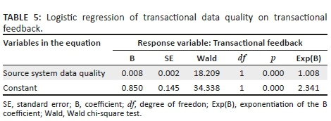 Logistic regression was used to assess inferentially the relationship between transactional data quality from the data creator (i.e. contact centre) and transactional feedback from the data consumer (i.e. field technician). This tool is preferred as the independent variable, source system data quality is a ratio-scale variable measured in percentages and the response variable, transactional feedback, is a binary value where 1 = correct and 0 = incorrect. The results in Table 5 illustrate that transactional feedback is significantly dependent on source system data quality (Wald statistic = 18.209, df = 1, p = 0.000).