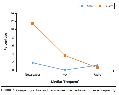 In the occasional instance (Figure 5), the active curve for the three media (newspaper, television and radio) appeared above the passive curve, depicting more instances of 'occasional' but purposeful usage compared to instances of information encounters. In both cases, newspaper took the lead, followed by television and radio. The broad pattern shows that more instances of occasional (active) usage of newspaper, television and radio in that order correspond to (passive) information encountering in those sources in the same order.