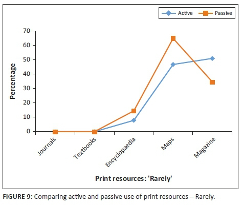 Comparing active and passive data on rare instances in print sources usage show no cases of rare information encounter in journals and textbooks. For encyclopaedias, rare instances of information encountered are slightly more but equivalent to its rare active usage. In the case of maps, there are very large cases of rare information encountering experiences, somewhat equivalent to the large number that rarely used the source. Whereas, for magazines, reported cases of rare active usage are higher in relation to the information encountered in the medium (Figure 9).