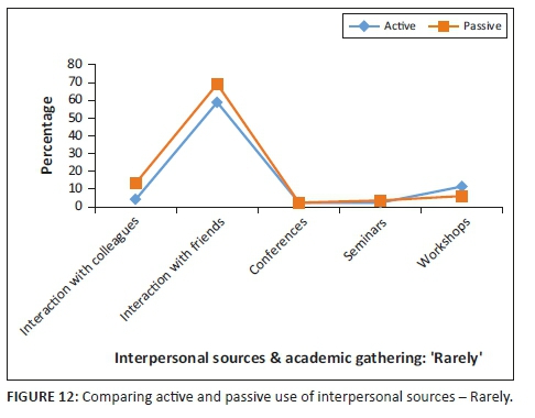 In the rarely category (Figure 12), an overall view shows a corresponding similarity between active instances of rare information seeking and passive instances of rare information encountering in interaction with colleagues and friends, and in conferences, seminars and workshops. There are slightly more passive instance of rare information encounter than its active counterpart in interaction with friends. This implies that friends are hardly ever used to obtain academic information, and consequently, information encountering hardly ever occurs. Interaction with colleagues has a low passive instance of rare information encountering with a corresponding lower instance of active information seeking. Conferences, seminars and workshops behaved similarly, with insignificant, but slightly higher, cases of active information seeking than information encountering in workshops.