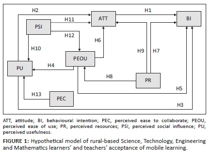 Perceived social influence is similar to the theory of reasoned action's subjective norm (Fishbein & Ajzen 1975:45), which was defined as 'a person's perception that most people who are important to him or her think that he or she should or should not perform the behaviour in question'. In this study, PSI is when rural high school STEM learners and teachers consider the opinion of those who are important to them whether they should or should not use m-learning. Learners and teachers in rural areas are influenced by messages about m-learning. This was suggested by Venkatesh (2000) who stated that people internalise the views of other people and make them part of their belief system. If STEM teachers and learners think that their community, learner's parents and department officials are expecting them to use m-learning, they would have a positive attitude towards m-learning. Hypotheses H10-H12 are as follows: