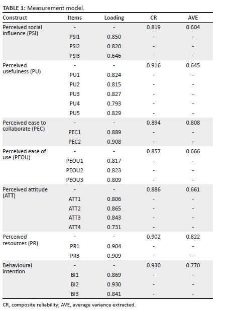 The measurement model describes the association between indicators and the latent variables. Following the suggestion by Hair et al. (2017) of assessing reflectively measurement models, the study examined composite reliability (CR), outer loadings, average variance extracted (AVE) and discriminant validity. First, the factor loadings and CR were used to test for item reliability and convergent validity, respectively. The results (Table 1) showed that almost all outer loadings were higher than 0.7 (Chin 1998) except PSI3 (0.646). The item was not removed because of the exploratory nature of the study and removing it did not increase the CR (Garson 2016). Items that were removed from the model because of having outer loadings lower than 0.7 were: PEOU4, PEOU5, ATT5, PR3 and PEC3. When these items were removed from the model, the CR of their respective constructs increased above the recommended threshold of 0.7 (Hair et al. 2017). The results confirmed item reliability. Composite reliability values show the extent to which the items indicate the latent variable. Table 1 shows that all the CR values exceeded the recommended value of 0.7 (Garson 2016). Second, the AVE values were used to assess convergent validity. Convergent validity assesses the degree to which measures of the same constructs positively correlates with each other (Hair et al. 2017). The AVE values indicate the average commonality for each construct in a reflective model (Chin 1998). All the AVE values were greater than the recommended 0.5 (Garson 2016). Third, the Heterotrait-Monotrait ratio of correlations (HTMT) and the Fornell-Larcker criterion were used to assess discriminant validity. Discriminant validity assesses the degree to which a construct is truly different from other constructs (Hair et al. 2017). Table 2 shows that all the HTMT values were under 0.9, and all the square roots of AVE were higher than the inter-construct correlations (Garson 2016). The results confirm discriminant validity.