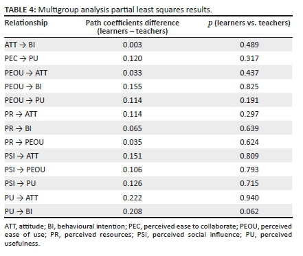 To answer RQ2, a non-parametric multigroup analysis (MGA) was used to test if there was a significant difference between rural-based learners' and teachers' path coefficients. Table 4 shows the results of MGA.