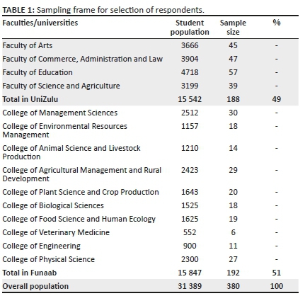 Given that the total number of undergraduate students at the UNIZULU 2016/2017 (UNIZULU Fact & Figure 2017) was 15 542, and the total number of undergraduate students at the Federal University of Agriculture, Abeokuta, 2017, was 15 847, the total population of the two universities was calculated as 15 542 + 15 847 = 31 389. Furthermore, to ensure that each respondent had an equal chance of being surveyed (Neuman 2011), the study adopted probability proportionate to size (PPS) in the selection of sample from each cluster (Nueman 2011) (see Table 1).