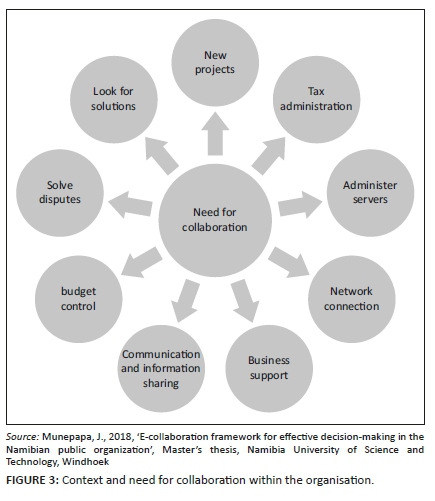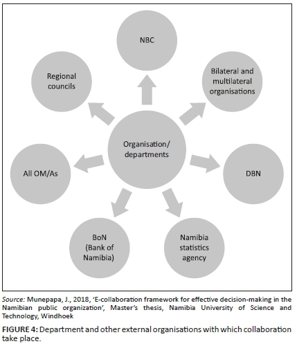 Another participant expressed that they worked with all Organisations, Ministry's or Agencies for budget allocation and control because the Ministry of Finance is focal of finances in the public sector. Participants within the Department of Inland Revenue (IRD) expressed that they worked with many external stakeholders for all the tax administration and collection. Several participants alluded to the fact that most public organisations consist of highly dispersed departments for the purpose of getting closer to the people; this has enabled them to be located within all corners of the country. In addition, employee transfers, relocation and reorganisation are common occurrences in public organisations, thereby encouraging information sharing and stressing the importance of collaboration in public organisation, and the significant of e-collaboration when making a decision. Collaboration can re-invigorate organisations by fully engaging employees, improving retention, breaking down silos and fostering cross-functional activities to encourage better innovation.
