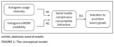 The influence of Instagram conspicuous consumptive behaviour on purchase intentions has rarely been researched. However, consumers' social media usage and eWOM's influence on conspicuous consumption have been studied (Taylor & Strutton 2016; Thoumrungroje 2014). This study aimed to explain the determinates of Instagram conspicuous consumptive behaviour and how that behaviour influences their intention to purchase luxury goods using the proposed model. Instagram provides an effective platform for consumers to build personal networks and express themselves. Social media has enabled digitally empowered consumers to share information about products or brands and consequently influence their purchase decisions (Ismail et al. 2018).
