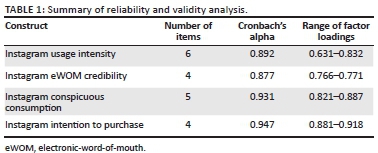 The demographic characteristics provided in Table 2 indicate the results from 364 respondents. A total 196 of the responses were female and 168 were male (54% vs. 46%). Most of the sample consisted of respondents aged 25-34, indicated by their 43% response rate. Furthermore, the study revealed that 29% of respondents spent over 3 h on Instagram daily. This is consistent with current statistics depicting the generous growth of Instagram over the years (Patrcios & Golstuck 2018).