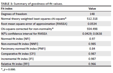 The hypotheses of this study were tested by means of structural equation modelling. The research model was tested using Statistical Package for the Social Sciences (SPSS) version 24. The overall fit for both the measurement and structural models measured showed a p-value of 0.000, which indicates significant models. Illustrated in Table 3 is a summary of the goodness-of-fit values.