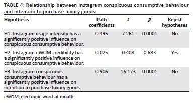 The results of the study proved that Instagram usage intensity significantly influenced conspicuous consumptive behaviour (t < 7.261; p < 0.0001). Users who spend more hours on Instagram daily are more likely to be influenced into conspicuous consumptive behaviours. Conversely, eWOM credibility indicated no influence on conspicuous consumptive behaviour. Electronic-word-of-mouth credibility does not significantly influence conspicuous consumptive behaviour. User do not trust, believe or regard their interactions on Instagram as factual. This inconsequential result is evident from a reported t-value score of 0.408 and a p-value of 0.683, which is over the accepted significance level of a p-value of 0.05. Of all the factors examined in this study, Instagram conspicuous consumptive behaviour had the greatest influence on intention to purchase luxury goods. This influence is evident in the study results that reported a t-value score of 16.173 and a p-value of 0.0001, which is within the generally accepted significance level of a p-value of 0.05.