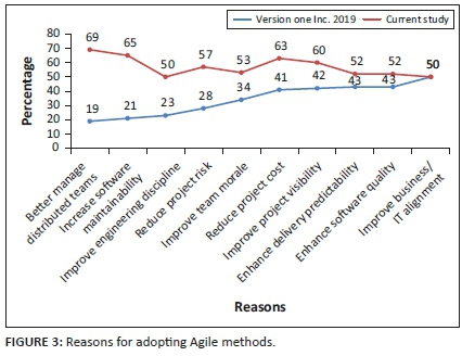 The top five main reasons stated by respondents on why they are adopting Agile in their software projects are that Agile manages the distributed teams better (69%), increases software maintainability (65%), reduces project cost (63%), improves project visibility (60%) and reduces project risk (57%). Comparing results of this survey and of VersionOne Inc. (2019), it can be confirmed that people working on Agile projects are beginning to see reasons for adopting Agile to benefit the success of their software projects. Figure 3 shows the reasons for adopting Agile.