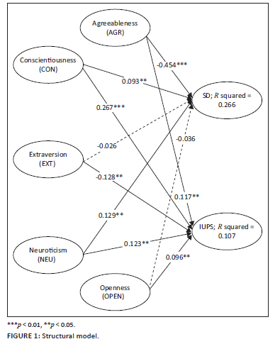 Two indicators were used to assess the quality of the structural model. Firstly, the in-sample predictive power of both endogenous latent variables (expressed as R2) was inspected. In short, the R2 value of an endogenous variable explains to what extent the related exogenous variables influence the variance in the endogenous variable in question. Here, it was found that the personality traits evaluated explained 26.6% (R2 = 0.266) of the variance in the social desirability latent variable and 10.7% (R2 = 0.107) of the variance in the latent variable intention to use privacy settings. Secondly, the out-of-sample predictive power (Stone-Geisser's Q2) of the endogenous latent variables in the model was assessed (social desirability = 0.12 and intention to use privacy settings = 0.05, respectively). Given that both these Q2 values were in excess of 0, it was concluded that the model has an adequate amount of predictive power (Stone 1974).
