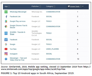 In South Africa, the use of smartphones, and therefore apps, has become ubiquitous (Minnaar, Mototo & Chuchu 2020), and it is common for organisations to 'guide their business through online platforms' such as apps (Maziriri et al. 2020). As shown in Figure 1, of the top 10 Android apps in South Africa during September 2019, the majority fell within the 'Tool' and 'Social' app categories, followed by those apps that fall within the 'Communication' app category (SimilarWeb 2019).