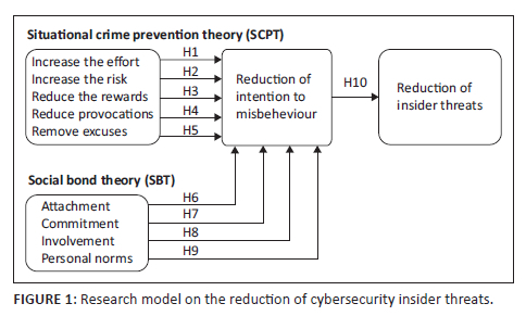 Organisations are more focused on boosting the technology investment to protect themselves against external cyberattacks, and not enough emphasis is put on the insider threat aspects (Safa et al. 2019). Effective cybersecurity measures cannot be realised when the roles of users are not taken into consideration, as threats and attacks from employees may have a negative impact on the operation of the organisation's computer systems (Lamba et al. 2019). Furthermore, Clarke (2018) found that organisations are not putting enough effort towards reducing cybersecurity insider threats to improve their security posture and foster organisational culture change in security behaviour. Even though organisations consider cybersecurity insider threats as a risk to their business operations, there is a necessity to have a full view and interdisciplinary approach that considers the technological aspect of cybersecurity insider threats along with the human or insider element, which is difficult for organisations to detect, prevent or reduce. It is with this in mind that the study focused on the human or insider element by adopting the situational crime prevention (SCP) and social bond (SB) theories as a basis to develop a model to reduce cybersecurity insider threats in a South African telecommunication company. The study addressed the following research questions: