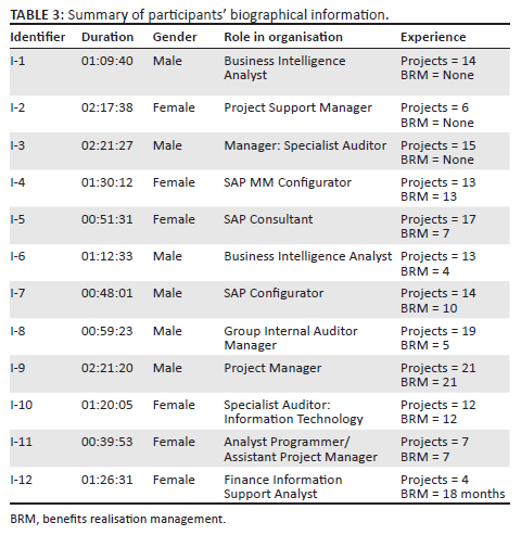 The interview sessions were recorded for ease of reference and the interviewees were informed about the recording. Consent forms were sent to the interviewees during the interview sessions, and the interviewees were able to read the form, sign it and return it. The first interview conducted was a mock-up, which was used to test the relevance of interview questions as well as to confirm whether participants would be able to understand the research interview questions and provide responses as expected. All participants were found to be involved in projects or BRM. The number of years in the organisation ranged from 7 to 21, and the duration of the interviews varied from 39 min to 2 h and 21 min. Table 3 is a summary of the participants' biographical information.