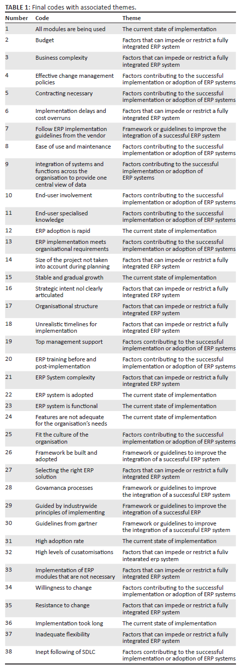 The size of the sample was limited to 30 participants with a target population of 35 to generate a confidence level percentage of 95 with an accuracy level of ± 3%. The researcher understood that the sample size could not be less than 30 participants to use statistical analysis (Oates 2005). Therefore, the qualitative analysis was simply performed to compare phenomena. The researcher only managed to secure 20 participants which was considered to be sufficient. Based on the research carried out by Guest, Bunce and Johnson (2006), data saturation had occurred for the most part around the time they had examined 12 interviews. They generated 92% of the overall number of codes developed after 12 interviews. Their findings also revealed that after analysing 12 interviews, new themes arose infrequently and gradually as the study progressed (Guest et al. 2006). Data were collected from individuals with the necessary knowledge and experience in the identified institution. The participants in the study included management, business analysts, test analysts and all other stakeholders involved in the planning and implementation of the ERP systems in the organisation. The data collected comprised the general background information of the organisation, the current state of ERP system implementation, challenges faced with ERP system usage in the organisation, the current ERP implementation process model and what the organisation considers as critical success factors in the implementation of ERP systems.
