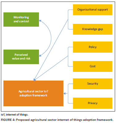 RESULTS: Priori themes for this study namely, organisational support, cost, knowledge gap, security and policy were confirmed as significant in the adoption of IoT in the Limpopo agricultural sector. Monitoring, control, perceived value, and risk emerged as new themes in the adoption of IoT