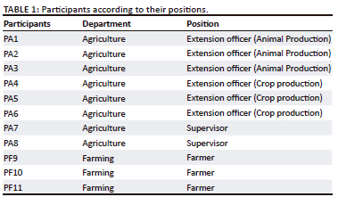 In this study, 11 stakeholders from the agriculture and farming industries were interviewed. The participants were specifically chosen since they worked in the agricultural industry. Extension officers, supervisors, assisted in recruiting the participants. Each interviewee was given a unique code to ensure that their privacy was protected. These codes started from PA1 to PA11 (see Table 1 for details) in order to maintain anonymity of the participants.