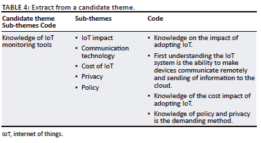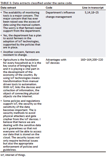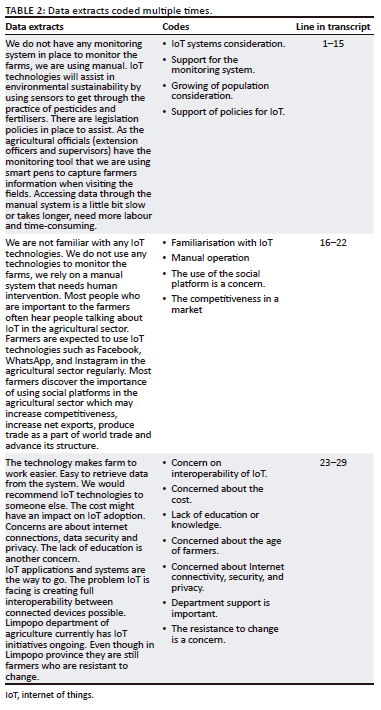 The focus of this research was to identify the elements that may influence the adoption and use of IoT in the Limpopo agriculture industry. Thematic analysis was chosen as the data analysis method for this study. The use of codes in thematic analysis contributes to the emphasis on transcription accuracy. Figure 2 shows examples of data extracts coded multiple times.