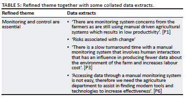 Monitoring and control emerged during the interviews and influenced the adoption of IoT within the agricultural sector in Limpopo. Internet of things-enabled devices that use sensors to monitor product condition, the external environment, and product use in great detail. Findings of this study indicate that because of technological improvements, Internet access is expected to be available anywhere and at any time. Devices may be easily connected, and associated information can be accessed globally thanks to the development of low-cost smart sensor nodes. Table 5 shows some data extracts from the monitoring and control are essential refined theme.