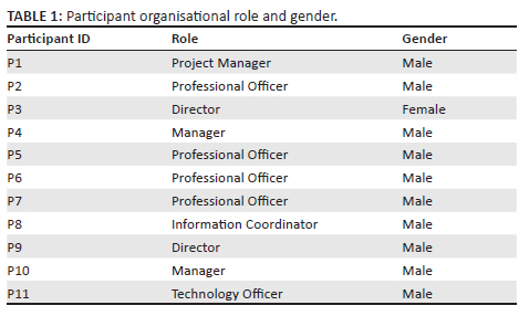 This study used a qualitative approach to understand the factors that affect BD adoption in a government organisation in the Western Cape. This research required in-depth engagement with the participants to gain a comprehensive insight into the problem being addressed. Data were collected from 11 participants (see Table 1) from different departments within the organisation, and all participants were part of a single government organisation in the Western Cape. Data were collected through open-ended interviews. The 11 participants held various titles within the organisation and included 1 project manager, 4 professional officers, 2 directors, 2 managers, 1 information coordinator and 1 technology officer.
