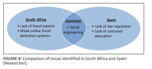 The study focussed on a specialised area of online banking fraud; suitable participants who possess knowledge of online fraud detection models were interviewed to acquire information about issues experienced in this area. The interviewee participants had different backgrounds and worked in different areas in the banking fraud department. The reason for selecting participants from different backgrounds was to obtain a holistic range of knowledge overview of the online fraud detection models. The participants consisted of fraud technical managers, fraud investigator specialists, fraud technical specialists and data scientists and/or analysts. The main issues identified by South African participants included lack of fraud experts and weak detection systems. From the Spanish perspective, the main issues included lack of customer education and lack of law regulation. The main common issue identified by both nations is social engineering. Figure 4 illustrates the identified issues from both nations.