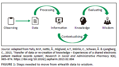 Carr, Christ and Ferro (2023) state that the intersection of appropriately implemented technology and human participation within digital health systems results in outcomes which exceed that of isolated human involvement. Tully et al. (2013) argue that the Data-Information-Knowledge-Wisdom pyramid is an appropriate apparatus to use when investigating digital health system components. The Data-Information-Knowledge-Wisdom pyramid has been rearranged as a sequence in Figure 1 to illustrate the steps that can lead from data to wisdom.