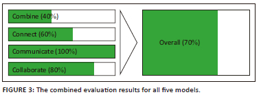 Each of the five eHealth models selected was scored based on the evaluation criteria which gave a score out of 25. The scores were then grouped according to the eHealth model aims. They were scored as follows: combine (score out of 6), communicate (score out of 4), collaborate (score out of 9) and connect (score out of 6).