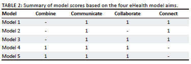 Models 1, 3, 4 and 5 shared the same overall scores. Model 2, however, scored lower overall. This is due to its lack of representing a consolidated repository and not adequately representing the relevant stakeholders. The scores of all five models were simplified and averaged based on the eHealth model aims and expressed as a percentage. If an aim was catered to in a model, then a score of 1 was assigned; if not, no score was assigned. The summary of the scores is represented in Table 2.