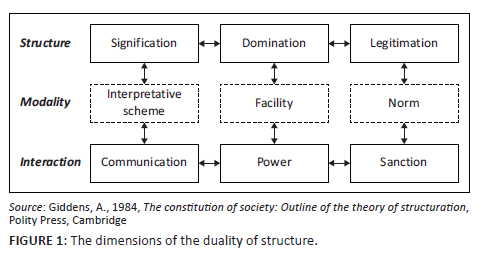 The actions of the agent and structure are interdependent and produce and reproduce across time and this is a result of duality. The duality of structure in Structuration Theory implies that structures not only constrain human agency but are also continually reproduced and transformed through the actions of individuals. Signification, dominance and legitimation are the three aspects of duality of structure that are frequently used as interpretive frameworks to reflexively maintain communication within social systems. Modalities highlight ways in which the duality of structure works out in practice. For instance, institutions of domination mean that power resources are available as facilities to some agents (e.g. managers) and not others. Moreover, the ways that facilities are applied and maintained help reproduce domination in society and organisations (Giddens 1984). The modalities (interpretative schemes, facilities and norms) connect the process of interaction (communication, power and sanction) with the structural elements (signification, domination and legitimation) of social systems (Giddens 1984), as shown in Figure 1.