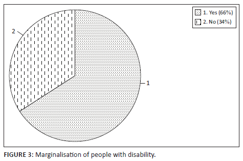 On the extent of the disability and marginalisation, it is apparent from the findings of this study that people with disabilities are marginalised (Figure 3). This was confirmed by 66% of the participants that they are marginalised because of their disability. Consistent with the findings of this study, Owens (2013) found that disabled people are severely marginalised and are among the poorest in developing countries. Moreover, Johansson et al. (2021) reported that hearing impairment increased the odds of access to the Internet as compared to the general population. This was also noted by Dobransky and Hargittai (2006). Additionally (Peters et al. 2009), asserted that people with disability are severely marginalised. There is repeated stigmatisation including negative narratives and stereotypes from older people as well as peers in the learners' lives and this leaves them holding onto these stigma realities (Mueller 2019).
