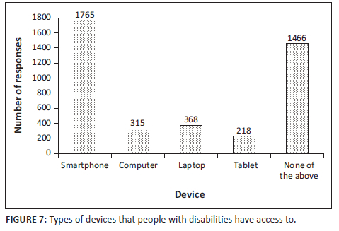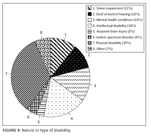 Most of the respondents who participated in this study had a physical disability (33%), followed by intellectual disability (18%), mental health conditions (14%), vision impairment (11%), and some of them were deaf (10%), as highlighted in Figure 4. A study conducted by Hinman, Peterson and Gibbs (2015) discovered that the number of pupils with a physical disability was less than 5%, with most individuals having sensory impairments. According to Adnams (2010), there is a higher prevalence of intellectual disability in Africa than in high-income countries. High levels of intellectual disability in South Africa are associated with high levels of poverty, malnutrition and poor or inaccessible healthcare services (Kromberg et al. 2008). According to Lazar and Jaeger (2011), PwD, especially those who are blind or have low vision, are often the most affected when it comes to accessing technology.