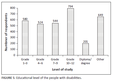 It is encouraging that 64% of people with disabilities who participated in this study are literate. Whereas only 36% are unable to read or write. Consistent with the findings of this study, Groce and Bakhshi (2011) reported that most PwD do not have access to education and training. This contributes to the elevated level of illiteracy among people with disabilities. Similarly, the Global Education Monitoring Report (Global Education Report Team 2013) indicated that only 47% of young people in Uganda who had either a physical or hearing impairment were literate, compared to 60% of young people with no disability. In terms of the educational level of PwD, 794 had grades 10-12, 649 had no formal education, 580 had grades 1-3 and 544 had grades 7-9. Only 201 had a Diploma/Degree (Figure 5). These results indicate that strategies must be developed to make education more accessible to PwD. Consistent with the findings of this study, Statistics South Africa (Stats SA 2014) revealed that, in South Africa, just 5.3% of those with severe impairments attained higher education, while almost 24% had no basic education at all. Statistics South Africa (Stats SA 2015) further revealed that the highest proportion of persons aged 20 years and older with no formal education was recorded in under-developed communities regardless of the type of disability.
