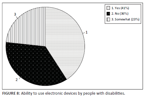 The results showed that only 41% of the respondents could use electronic devices independently, with no assistance. Whereas 36% could not use electronic devices at all (Figure 8). To note, the respondents who could use electronic devices are those with mild disabilities compared to respondents with severe intellectual disabilities. These results are consistent with those by Duplaga (2017), who reported that Internet usage was less likely among people with severe disabilities when compared to people with mild disabilities. People with disabilities do not use the Internet or similar technologies because of several constraints that make the technology unsuitable for a wide range of disabilities (Lazar & Jaeger 2011). Similarly, Brennan (2020) reported that people with disabilities lag in basic access to technology, healthcare facilities and other basic services.