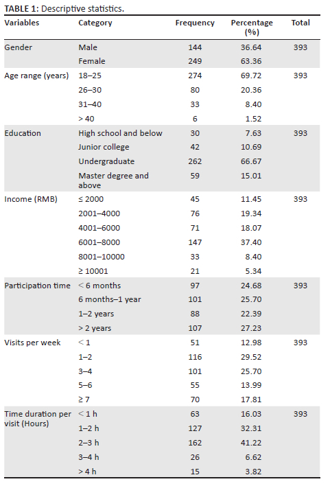 People who have participated in the virtual brand community are applicable targets for data collection. We collected data through an online survey conducted on wenjuan.com, one of the largest online questionnaire service companies in China. The questionnaire consists of three parts: the demographic information of the respondents, the specific situation of the respondents' participation in the virtual brand community and the measurement of relevant variables in this article. To ensure the authenticity of the collected data, respondents were also asked to write down the names of the communities they frequently visited in the questionnaire, which could help us quickly eliminate unreasonable questionnaires. Before data collection, we did a pre-test. We distributed 170 questionnaires, of which 142 met the recommendation for the number of samples in the small sample test stage. Then, we used SPSS23.0 to conduct factor analysis on the small sample data. The results showed that a total of eight factors with eigenvalues greater than 1 were extracted, and the cumulative explanatory variance was 79.361%. In addition, the factor load of each item on its corresponding factor was greater than 0.5, and the number of factors extracted was consistent with the number of variables in the questionnaire. The pre-test data preliminarily showed that the overall quality of the scale was good, and formal sample collection could be carried out next. In this article, 425 questionnaires were officially collected through online survey, and 393 valid questionnaires were obtained after excluding the invalid ones, with an effective rate of 92.47%. The descriptive statistical analysis results of this survey sample are shown in Table 1.