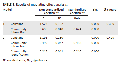 Regression analyses were used to test the mediating effect of community identification. The results are shown in Table 5. In model 1, community interaction had a significant positive effect on brand loyalty (β = 0.624, p = 0.000). In model 2, both community identification and community interaction had significant positive effects on brand loyalty (β = 0.240, p = 0.000 and β = 0.488, p = 0.000), and the R square of model 2 was significantly improved, indicating that the explanatory ability of model was enhanced. Therefore, it was proved that community identification played an intermediary role between virtual brand community members' interaction and brand loyalty, thus supporting H4.