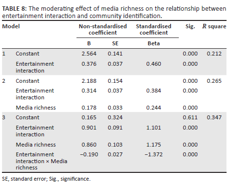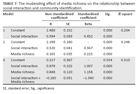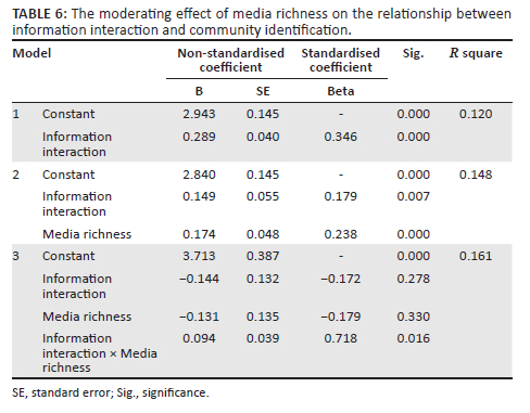 With community identity as the dependent variable, this article used the multilevel regression method to verify the moderating effect of media richness. Three multiple regression models were established to test the moderating effect: the first model introduced the independent variable, the second model introduced the moderating variable and the third model presented the interaction term of independent variable and moderating variable. If the regression coefficient of the interaction term was significant and R square was significantly increased, the moderating effect was significant: