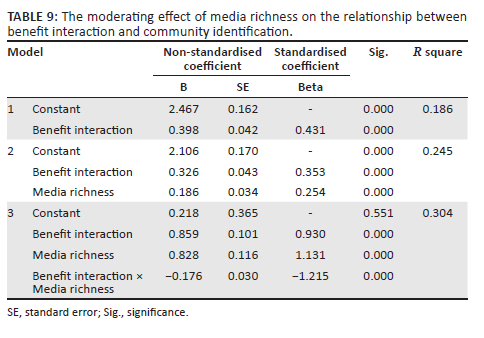 4. The moderating effect of media richness on the relationship between benefit interaction and community identification. It could be seen from Table 9 that the regression coefficient of the interaction term in model 3 was 0.176, p = 0.000, and the R square of model 3 was significantly improved, indicating that media richness had a significant negative moderating effect on the relationship between benefit interaction and community identification. The above conclusion was contrary to our hypothesis; thus H5-4 was not supported.