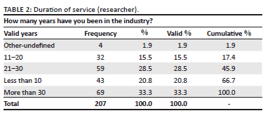 The descriptive statistics of the study participants are presented, depicting the participant's duration of service and the role the participants play in the various industries across Gauteng, South Africa.