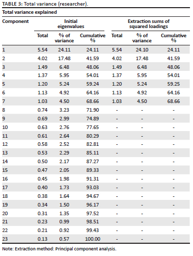 Statistical Package of Social Sciences results of the EFA using principal component analysis (PCA) reveal that the first component explained 24.109% of the total variance, followed by the second component explaining 17.476% resulting in a cumulative 41.586% across two components. This falls short of the rule-of-thumb threshold of 50% for one component, and that common method bias would not be a concern for this study. The extraction of the 23 other factors indicates that the variance is distributed across multiple factors, suggesting that further data analysis was possible.