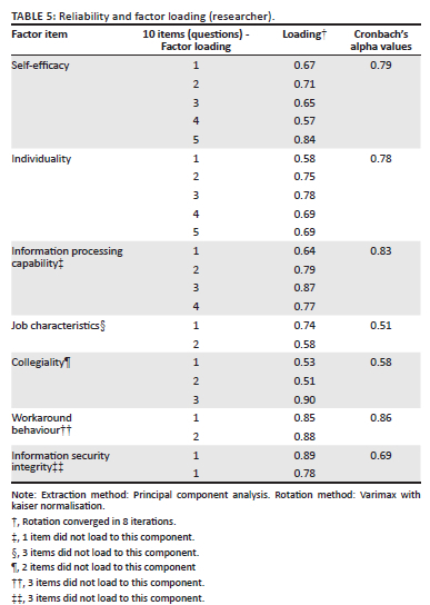 This Table 5 shows that items that did not load into their components were removed and not included for further analysis. The Cronbach's alpha values were greater than 0.5 are deemed appropriate in information systems research (Street & Ward 2012).
