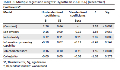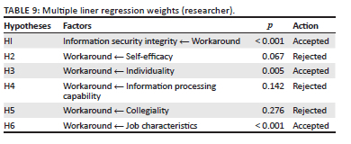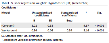 The hypotheses to be included in the model were tested using multiple linear regression analysis. This was done to test and determine whether there was an existing relationship between independent variables and the dependent variable, information security integrity (as well as workaround behaviour). Table 7 displays the regression analysis's findings.