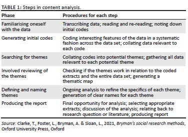 Qualitative data analysis techniques were used in this study, in the form of content and thematic analysis. The data were arranged into different themes. Table 1 shows how the content was analysed (Clark et al. 2021).