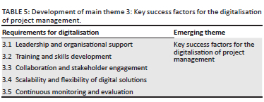 The third objective of the study sought to ascertain the key success factors for the digitalisation of project management within the South African mining industry. Table 5 illustrates the development of the emerging main theme 3: key success factors for the digitalisation of project management.
