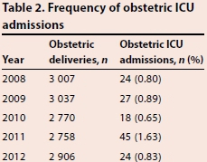 A retrospective review of obstetric admissions to the ICU of Pietersburg Hospital, Limpopo, SA, was carried out over a period of 5 years (1 January 2008 to 31 December 2012). The 12-bed multi-disciplinary ICU admitted 350 - 450 patients on average per annum. ICU admission in this institution is based on the clinical judgment of the admitting discipline in consultation with an anaesthetist.