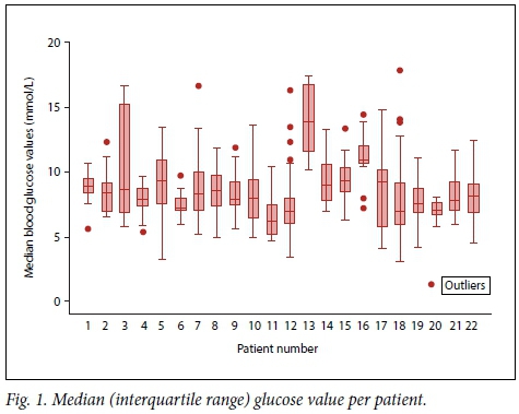 During the data collection period, 22 patients were admitted, of whom 13 (59.1%) were male and 9 (40.9%) were female. The mean age of patients was 48.5 years and the age range was 17 - 76 years. The median (interquartile range (IQR)) length of stay in ICU was 4 (3 - 5) days, with 2 patients staying in the ICU for >20 days. The surgical procedures performed included 17 (77.3%) valvular procedures, 3 (13.6%) coronary artery grafts, and 2 (9.1%) 'other' procedures. The median (IQR) blood glucose concentration was 7.8 (6.7 - 9.3) mmol/L (Fig. 1). The glucose readings ranged from 3.1 to 17.8 mmol/L. Table 2 shows the number of glucose readings obtained within the different glucose ranges. According to the glucose control protocol in place at the time of the study, 629 (84.9%) of the readings were abnormal, i.e. outside the required glucose range. The target range of 4.1 - 6.0 mmol/L was only observed in 112 (15.1%) of the glucose readings.