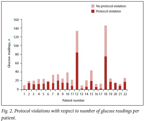 RESULTS. A total of 741 glucose readings for 22 patients were evaluated. The median (interquartile range) glucose reading was 7.8 mmol/L (6.7 -9.3 mmol/L). Overall, 411 (55.5%) protocol violations were recorded and 629 (84.9%) of the total readings were abnormal. Protocol violations were similar between the day and night staff; 188 (54.7%) and 223 (58.5%) were recorded, respectively (p=0.256). Of the readings, 464 (62.6%) were conducted by ICU-trained nurses and 245 (33.2%) by non-ICU-trained nurses. There were fewer protocol violations recorded by the ICU-trained nurses compared with the non-ICU-trained nurses, i.e. 53.3% and 63.7%, respectively (p<0.05).